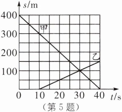 5.A [解析]由图像可知,甲在40s内通过的路程为400m,甲的运动速度为$v_{甲}=\frac{s_{甲}}{t_{甲}}=\frac{400m}{40s}=10m/s$,故A正确;由图像可知,在0~10s内,甲做匀速直线运动,而乙处于静止状态,10~30s,甲、乙均做匀速直线运动,故B错误;由图像可知,在0~10s内,乙处于静止状态,在10s后乙物体才做匀速直线运动,所以乙比甲要晚10s出发,故C错误;由图像可知,甲、乙相遇时(即两图线相交),甲通过的路程为400m - 100m = 300m,乙通过的路程为100m,故D错误。