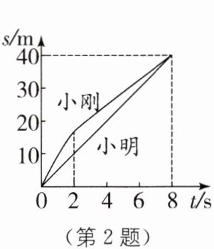 2.B [解析]由图像可知,在前2s内,小刚运动的路程比小明长,所以根据$v=\frac{s}{t}$可知,小刚的平均速度大于小明的平均速度,即小刚跑得较快,故A错误。当小刚通过的路程为20m(一半路程)时,从图中找出此时的时间,如图所示。