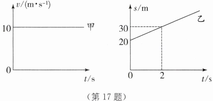17 甲、乙两车同时同向运动,甲车从 A 地出发,乙车从距 A 地 20 m 处出发(乙车在甲车前),甲车的 v-t 图像和乙车的 s-t 图像如图所示。则由图像可知( )。