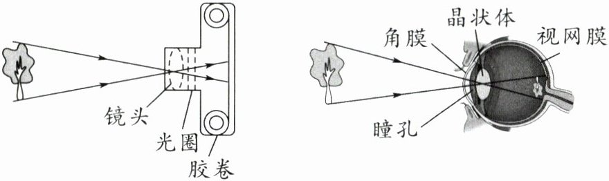 (1)眼睛好像一架照相机,晶状体和角膜的共同作用相当于照相机的镜头。像成在视网膜上,视网膜相当于胶卷;透过光线的瞳孔与照相机光圈功能相同。