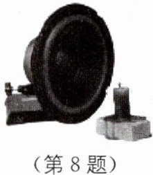 8. 如图所示,将点燃的蜡烛放在发声喇叭前方,可以看到烛焰随着声音晃动. 喇叭的纸盆由于______产生声音,声音通过______传播到烛焰处,烛焰晃动说明声音具有______.