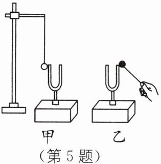 5 如图所示,在教室里,小明敲响乙音叉时,与甲音叉的叉股接触的乒乓球会弹起来,这一现象既可以说明发声的物体在______,也能说明声音可以在______中传播;若在月球表面上进行此实验,则______(填“还能”或“不能”)观察到上述现象,这是因为______.