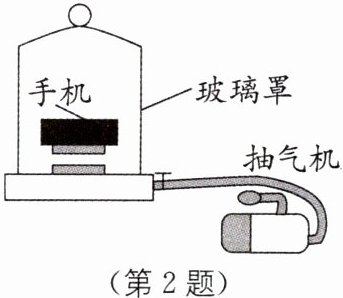 2 如图所示,手机被置于密闭的玻璃罩内悬浮,致电这部手机时,持续铃响,启动抽气机,听到的铃声逐渐变小,直至听不到;重新放气时,人又听到铃声,以下判断正确的是( ).
