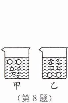 8. 水沸腾后可以产生大量气泡,其情形是图中的____(填“甲”或“乙”)烧杯;小琪同学把温度计放入另一个正在加热的烧杯中时,会发现水温____(填“升高”“不变”或“下降”).