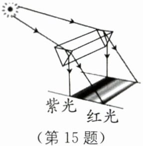 15. 太阳光通过三棱镜后被分解成了红、橙、黄、绿、蓝、靛、紫几种颜色的光(如图所示),此实验不仅表明了白光是由各种色光混合而成,而且表明了______光通过棱镜后偏折的程度比其他颜色的光要小.据此可以推断,红光在进入棱镜时的折射角较______(填“大”或“小”).