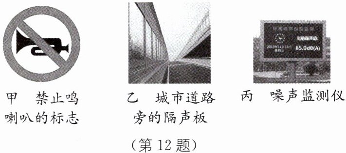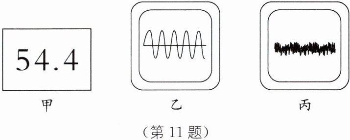 11 图甲所显示的数字的单位是______,当有几辆重型汽车并排通过时,显示屏上的数据将会______(填“变大”“不变”或“变小”),图______(填“乙”或“丙”)最有可能是此时声音波形图.