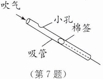 7 如图所示是用吸管和棉签制作的鸟鸣器,从管口吹气,能发出类似鸟叫的声音,鸟鸣器发声是由空气______产生的,拉动棉签可以改变声音的______,根据声源的差异,鸟鸣器可以与小提琴、笛子、鼓这三种乐器中的______归为一类.