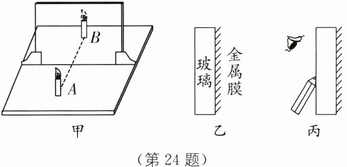 24. (7分)小明同学在做“探究平面镜成像特点”的实验中,将一块玻璃竖直架在水平台上,取两支完全相同的蜡烛A和B进行实验,如图甲所示.