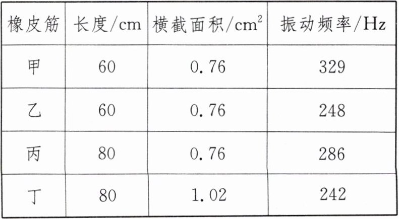 |橡皮筋|长度/cm|横截面积$/cm^2$|振动频率/Hz|