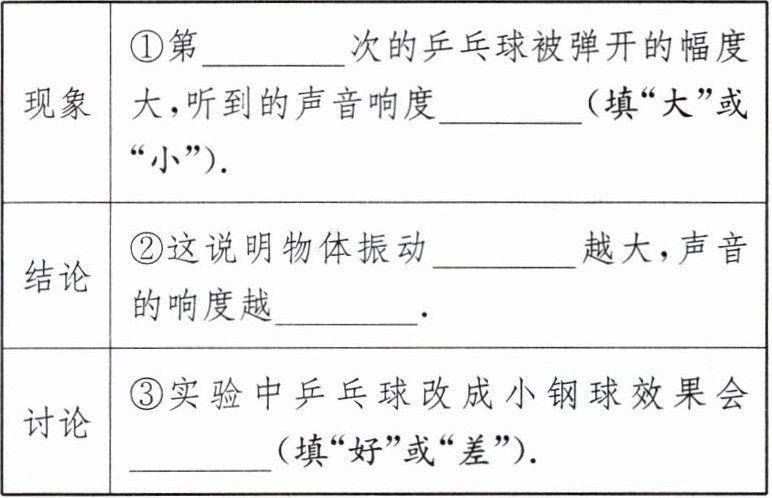 |现象|①第______次的乒乓球被弹开的幅度大,听到的声音响度______(填“大”或“小”).|