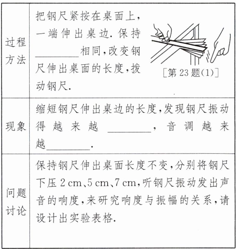 |问题讨论|保持钢尺伸出桌面长度不变,分别将钢尺下压2cm、5cm、7cm,听钢尺振动发出声音的响度,来研究响度与振幅的关系,请设计出实验表格.|