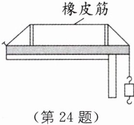 24 小江同学为了探究同种材料做的橡皮筋发出的声音的音调高低与张紧程度、横截面积、长度的关系,设计了如图所示的实验,采用了几个钩码和一个能够测量振动频率的仪器和甲、乙、丙、丁四根橡皮筋,其中甲、丙、丁张紧程度相同,与乙张紧程度不同.