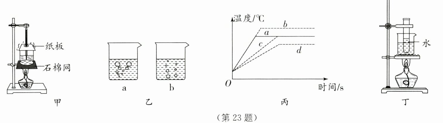 (5)根据记录在图丙中的数据画出水的沸腾图像.给半杯水加热,水的温度与时间的关系图像如图丙中$a$所示,若其他条件不变,给一整杯水加热,则水的温度与时间的关系图像正确的是______(填“a”“b”“c”或“d”).