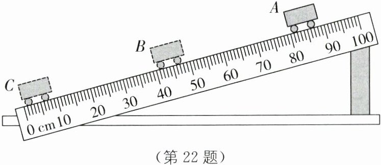 22. (12分)在如图所示的斜面上测量小车运动的平均速度.让小车从斜面的$A$点由静止开始下滑,分别测出小车到达$B点和C$点的时间,即可测出不同阶段的平均速度.