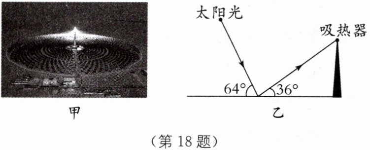 18 如图所示是我国的敦煌塔式光热电站.它由12000面"定日镜"围绕吸热塔组成,每面镜子能追踪太阳并把阳光反射到塔顶的吸热器上.如图乙所示是某个时刻太阳光经某定日镜反射后,照射到吸热器的光路图,请画出该定日镜并标出反射角的大小.
