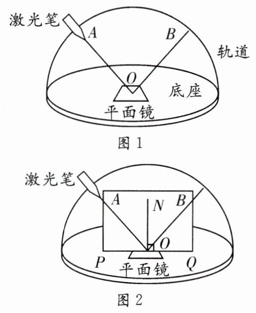 (2)多次改变激光笔在轨道上的位置,小红调整视角,均能观察到反射光OB 挡住入射光AO的现象.如图2所示,将长方形纸板与AO、OB 所在平面重合,其底边PQ 紧贴平面镜,在纸板上即可显示出入射光和反射光.多次测量纸板和平的夹角.