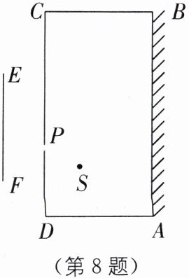 8 如图所示,ABCD 是一间不透光的房间,墙 AB 是平面镜,房间中 S 处有一个正在发光的小蜡烛,CD 墙上有一个小孔 P,在墙外不远处的另一白墙 EF 上会得到上下两个亮点,请在图中分别画出这两个亮点及其光路,上下亮点分别用 M 和 N 表示.(保留作图痕迹)