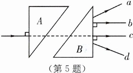 5 如图所示,两块完全相同的直角三角形玻璃砖 A 和 B 放置在同一水平面内,斜边平行且相距一定距离.一条光线从空气中垂直于玻璃砖 A 的直角边射入,从玻璃砖 B 的直角边射出,射出后的位置和方向可能是图中的( ).