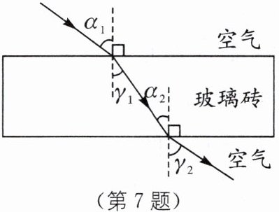 7 一束光从空气中斜射向玻璃砖并穿过,其光路如图所示.关于四个角的大小关系正确的是( ).
