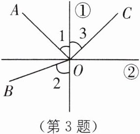 3 教材 P63 图 3-2·拓展 光在空气和水的分界面处同时发生反射和折射的光路如图所示.其中折射角为角______(填“1”“2”或“3”),分界面为______(填“①”或“②”),分界面的______方为水.当入射角减小时,反射光线与折射光线的夹角将变______.