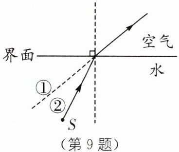 9 如图所示是光源 S 发出的光线从水中斜射入空气中的光路图.下列关于人在岸上观察到光源 S 所成像的说法正确的是( ).