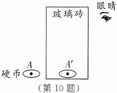 10 小文给同学们表演趣味小实验,她将一块厚玻璃砖竖立在桌面上,让小明站在玻璃砖右侧进行观察.小文将一枚硬币缓慢移至玻璃砖左侧某一位置时,小明惊奇地发现,硬币“进入”了玻璃砖内.