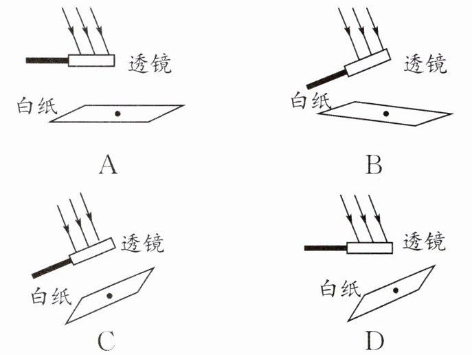 C [解析]利用会聚太阳光法测焦距时,要将凸透镜正对着太阳光,太阳光经凸透镜后将会聚在焦点的位置,所以把白纸(光屏)置于凸透镜另一侧,改变白纸与凸透镜间的距离,直到白纸上出现一个最小、最亮的光斑,这个光斑便为焦点,测出光斑到凸透镜的距离,即可得凸透镜的焦距.故A、B、D错误,C正确.