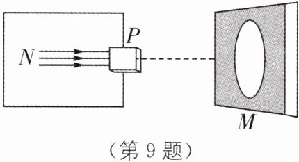 9 图中 N 是一个水平放置的长方体暗盒,盒内有水平向右的平行光,P 为暗盒右侧平面上的一个圆孔,M 是一个与暗盒右侧平面平行的相隔一定距离的光屏.若从外径与圆孔 P 相同的厚平板玻璃、凸透镜、凹透镜这三个光学器件中取一个嵌入圆孔 P 中,发现在光屏 M 上呈现一个比圆孔 P 大的圆形光斑,则嵌入圆孔 P 的那个光学器件( ).