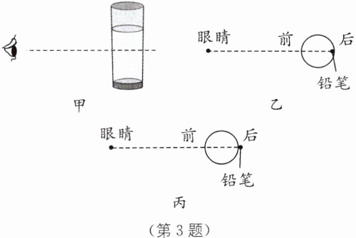 3 (2023·扬州中考)如图甲所示,在装有水的杯子里,小红将一支铅笔分别紧贴杯壁内、外竖直放置,两次都观察到铅笔放大的像,俯视图如图乙、图丙所示.下列说法正确的是( ).