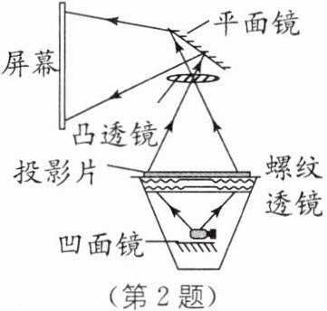 2 如图所示,若要增大屏幕上的像,则像距要增大,屏幕固定时投影仪要向______(填“左”或“右”)移;同时物距要减小,镜头要向______(填“上”或“下”)调.投影仪上的平面镜的作用是______,使像成在屏幕上,不改变像的大小.
