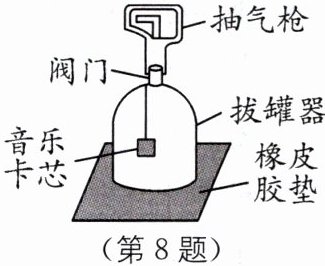 8 物理老师自制了“探究真空是否可以传声”的简易装置,如图所示.实验时将正在发声的音乐卡芯固定在拔罐器内,用抽气枪逐步抽出罐内空气.关于该实验,下列说法正确的是( ).