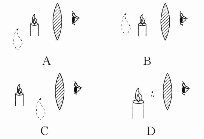 9 在“探究凸透镜成像规律”的实验中,当烛焰位于凸透镜一倍焦距内时,眼睛通过凸透镜观察到的虚像可能是图中的( ).