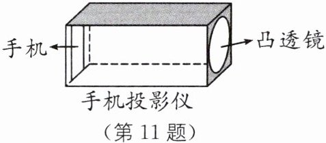 11 (2024·聊城中考)在学习了凸透镜成像规律后,小慧同学计划制作一个“手机投影仪”.现有器材如下:焦距分别为 10 cm、20 cm、30 cm 的凸透镜各一个,手机一部,长为 30 cm 的纸盒,胶带和剪刀等.“投影仪”模型如图所示,将手机和凸透镜分别固定在纸盒的两端,调整“投影仪”到墙面的距离,可在墙上看到手机画面清晰放大的像.下列说法正确的是( ).