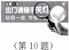 10 小京通过焦距为 10 cm 的凸透镜看到了提示牌上“关灯”两字放大的像,如图所示.下列说法中正确的是( ).