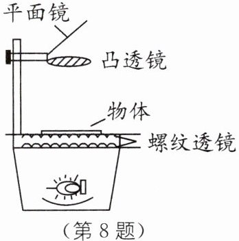 8 投影仪是教学中常用的仪器,如图所示是投影仪的结构图,在水平放置的凸透镜的正上方有一与水平面成 45°角的平面镜,右边竖直放一屏幕(未画出).物体发出的光线经过凸透镜和平面镜后,可在屏上成一清晰的像.一位教师在使用投影仪时,发现在屏幕上的画面太小,正确的调节方法是( ).