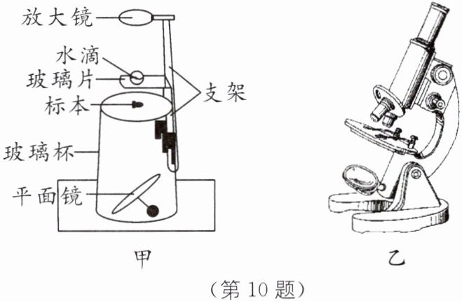 10 小华利用水滴、放大镜、平面镜、透明玻璃杯和可调支架等制作了一台“水滴显微镜”(如图甲所示)。调节支架高度,适当调整标本、水滴和放大镜三者之间的距离实现了与如图乙所示光学显微镜相似的成像效果。