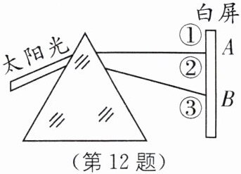 12 如图所示,一束太阳光通过三棱镜射到白屏上,屏上标出了三个区域,其中能使温度计示数明显升高的区域和能识别人民币真伪的区域应该是( ).