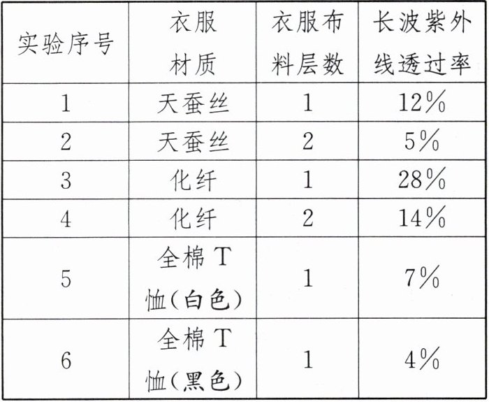 |实验序号|衣服材质|衣服布料层数|长波紫外线透过率|