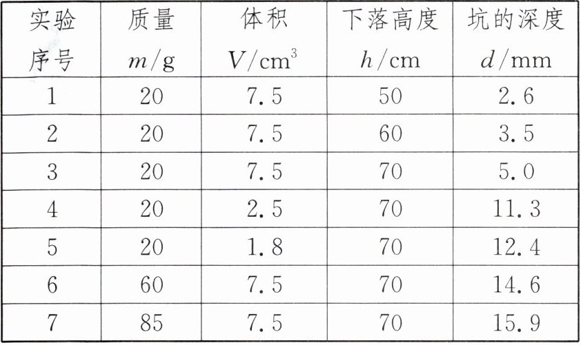 |实验序号|质量m/g|体积$V/cm^3$|下落高度h/cm|坑的深度d/mm|