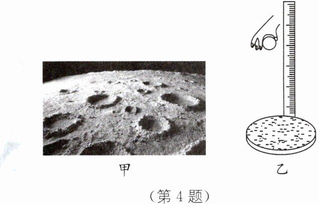 4 小军同学通过高倍望远镜观察月亮,发现月球表面是凹凸不平的,如图甲所示。这是由于流星在太空中运行到靠近月球时,在月球的引力作用下坠落到月球表面,与月球表面发生碰撞而形成的坑洞,叫作月坑。