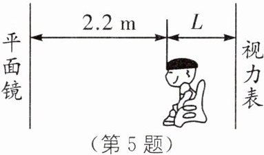 5. 检查视力的时候,视力表往往放在被测者头部的后上方,被测者识别对面墙上镜子里的像,要求被测者与视力表像的距离是5m。如图所示是小明同学在一次测量视力时的情景,关于这次视力测量说法正确的是( )。