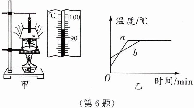 6 图甲是小明探究“水沸腾时温度变化特点”的实验装置,实验时每隔1 min 记录一次水的温度;小华利用同一装置,只更换烧杯中的水,重复上述实验.根据小明和小华的实验数据,分别作出水的温度随时间变化的图像a和b,如图乙所示.