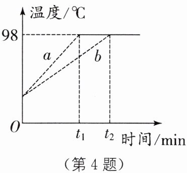 4 有两组同学在做“水的沸腾”实验,他们选用相同的实验装置,绘制成的沸腾图像如图所示.由图可知,他们做实验的时候大气压的值______(填“高于”“低于”或“等于”)标准大气压.图中a、b曲线没有重合的原因是______.