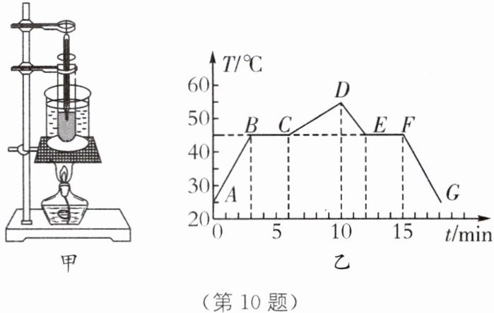 10 如图甲所示是观察某物质熔化和凝固的实验装置,如图乙所示是根据实验绘制的温度随时间变化的图像,下列说法正确的是( ).