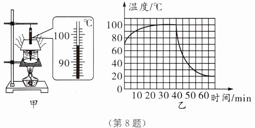(3)如图乙所示是小亮根据实验数据绘制的时间—温度图像(40 min后停止加热).由图像可知,本实验中水的沸点是______℃;在30~40 min内,温度计示数保持不变,此过程______(填“不再”或“继续”)吸收热量.