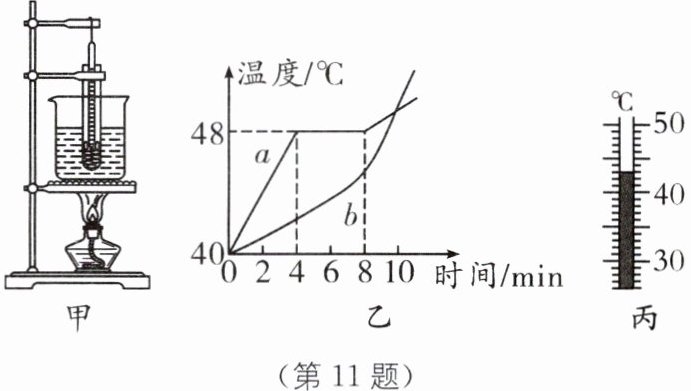 11 (2024·泰安中考)小文同学用如图甲所示装置“探究固体熔化时温度的变化规律”,用温度计分别测量a、b两种物质的温度,温度随时间变化的关系图像如图乙所示.