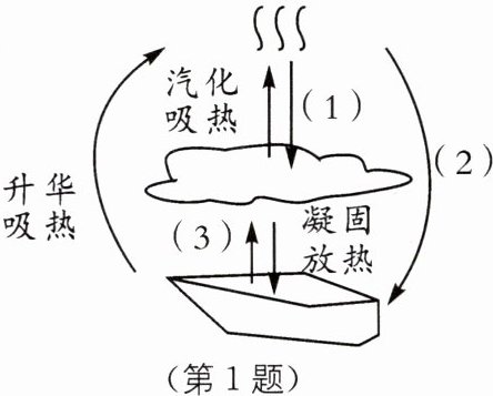 在自然界的水循环中,水的状态可以发生多种变化,并在状态变化时会伴随吸热或放热.小虎在归纳水循环示意图时,三个地方忘了写全,请你帮他按已整理的格式补充完整.