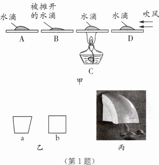 (3)同学们猜想水蒸发快慢还可能与水的质量有关,请设计实验进行验证:取相同的两个容器,其形状如图乙中的 b (填“a”或“b”)所示,分别倒入水量 不同 (填“相同”或“不同”)的水,观察比较 ② (填“①”或“②”,①哪个容器中的水先干;②相同时间内哪个容器内水减少得多).