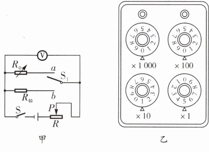 ②再将$S_{1}$拨至______处,调节电阻箱旋钮至图乙位置,使电压表示数正好为2 V,则该电阻的阻值为______Ω.