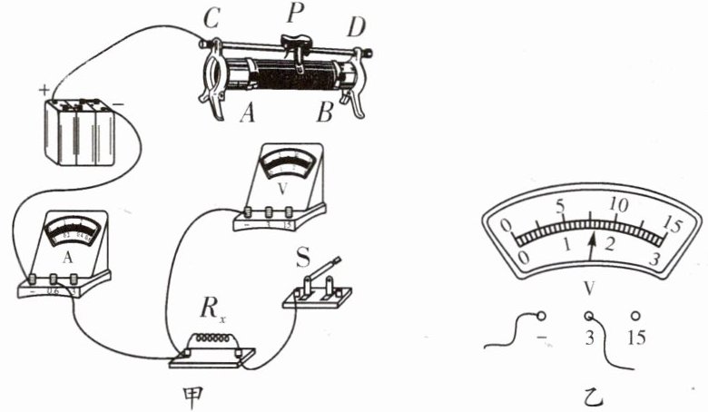 (3)重新正确连接电路后,闭合开关$S$,当滑片$P$移动到某一个位置时,电流表的示数为0.16 A,电压表的示数如图乙所示,则待测电阻$R_{x}= $______.